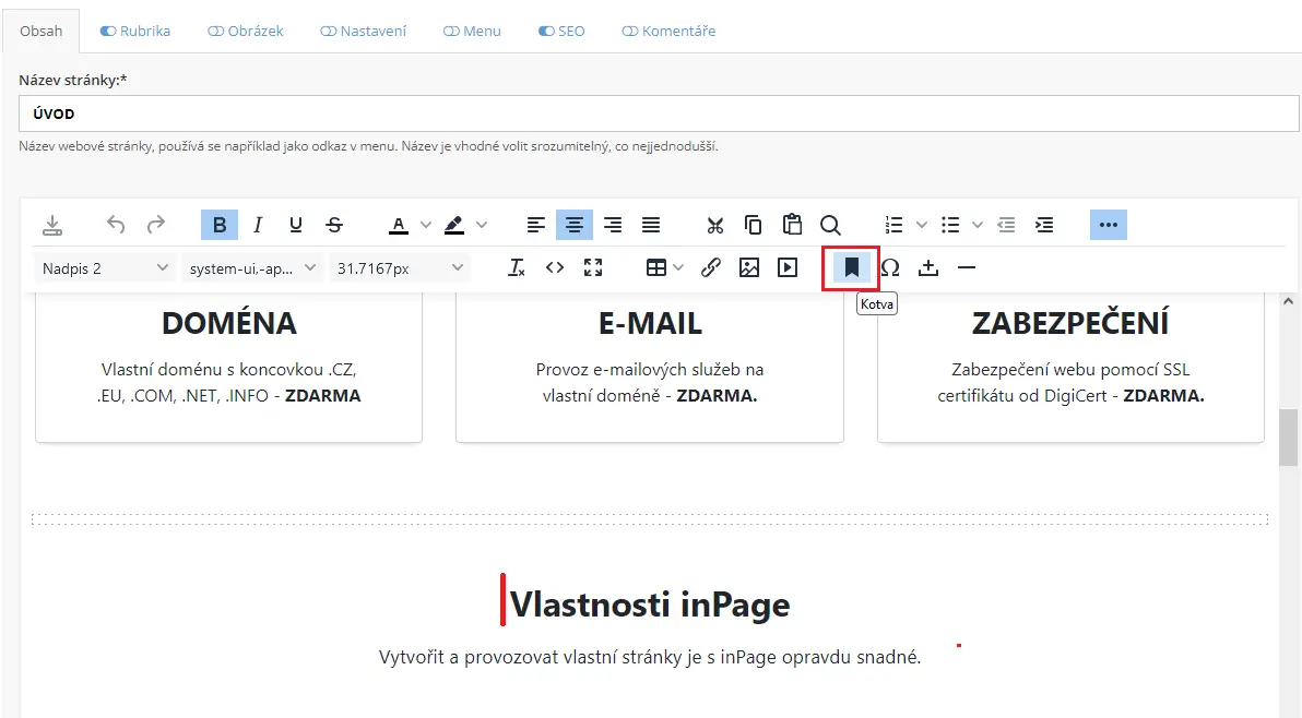 Abychom stránku snadno rozdělili a zpřehlednili, použijeme Kotvy, pomocí kterých můžeme vytvořit odkaz na libovolnou část vytvořené stránky.