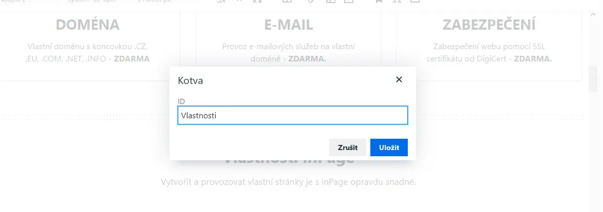 Vzhledem k tomu, že kotvy budeme využívat jako odkazy do hlavního menu, potřebujeme znát právě jejich ID. To je ve formátu #nazev kotvy. V našem konkrétním případu jsme si vytvořili kotvu s názvem vlastnosti, a proto odkaz na kotvu bude vypadat #Vlastnosti.