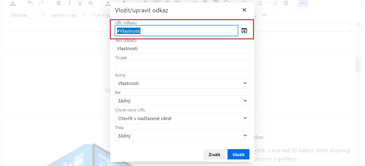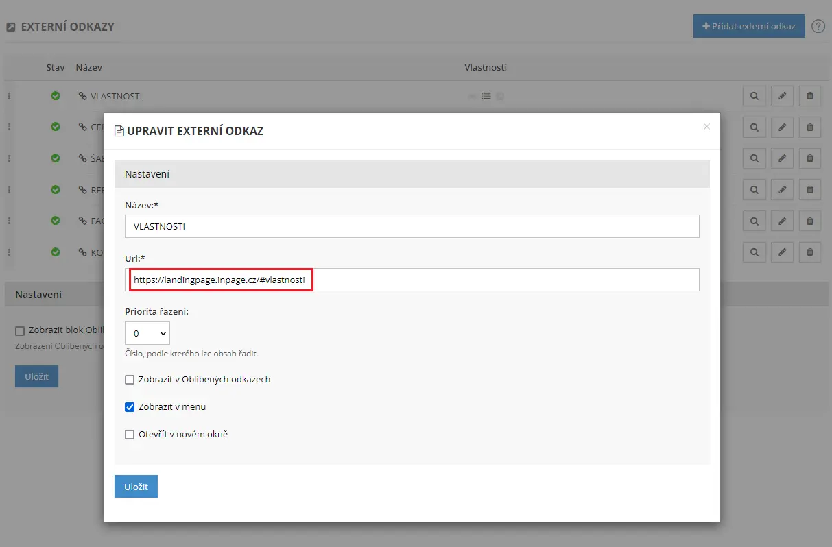 V našem konkrétním případě jsme vytvořili externí odkaz s názvem Vlastnosti a do pole URL vložili odkaz na kotvu - https://landingpage.inpage.cz/#vlastnosti