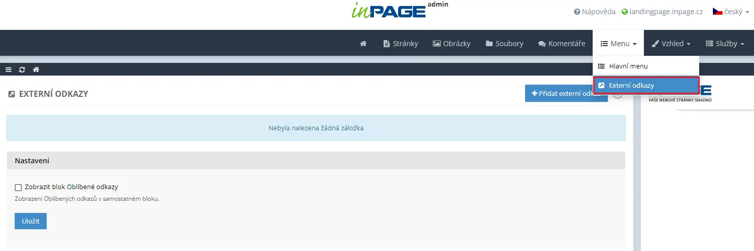 Vytvoření externího odkazu provedete v administraci webu v sekci Menu pod položkou Externí odkazy.