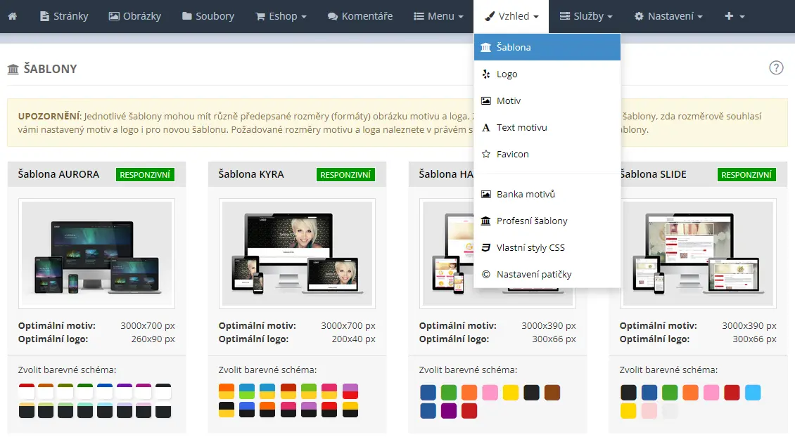 Prvním krokem, který je potřeba udělat při přípravě jednostránkového webu je výběr vhodné šablony. Šablonu si vyberete v administraci webu v sekci /Vzhled/ pod položkou Šablona.
