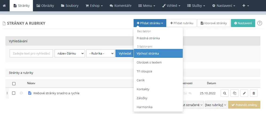 Vzhledem k tomu, že chceme vytvořit onepage site, tak nám překvapivě bude stačit jen jedna stránka. Nicméně aby bylo možné do stránky přidat větší množství různorodého obsahu, je třeba stránku vytvářet pomocí sekcí . Proto vybereme v sekci /Stránky/ možnost Přidat stránku se sekcemi a to hned první možnost Výchozí stránka. Neb obsah pak libovolně upravíme.