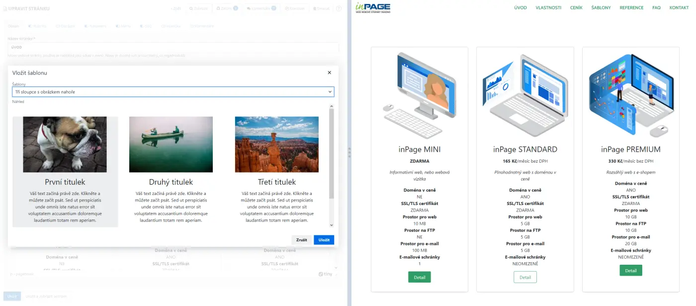 V našem ukázkovém webu jsme pro vytvoření ceníku použili sekci Tři sloupce s obrázkem nahoře. Tlačítka pak odkazují přímo do objednávky na webu inPage.cz.