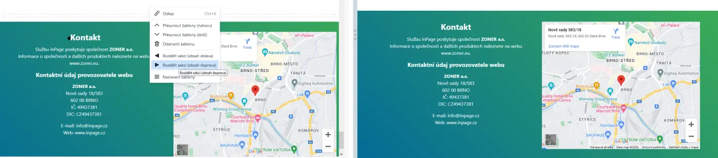 Na našem ukázkovém webu jsme vytvořili patičku pomocí sekce s názvem Mapa, kterou jsme si rozdělili na dvě části. Mapu nastavili na pravou stranu a do levé části pak přidali kontaktní údaje.