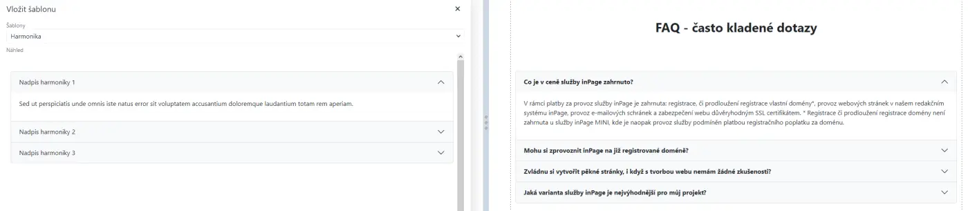Pro tuto část stránky jsme v našem ukázkovém webu využili sekci Tři sloupce s obrázkem nahoře pro zobrazení zákaznických referencí a dále pak sekci s názvem Harmonika pro zobrazení odpovědí na často kladené dotazy neboli FAQ.