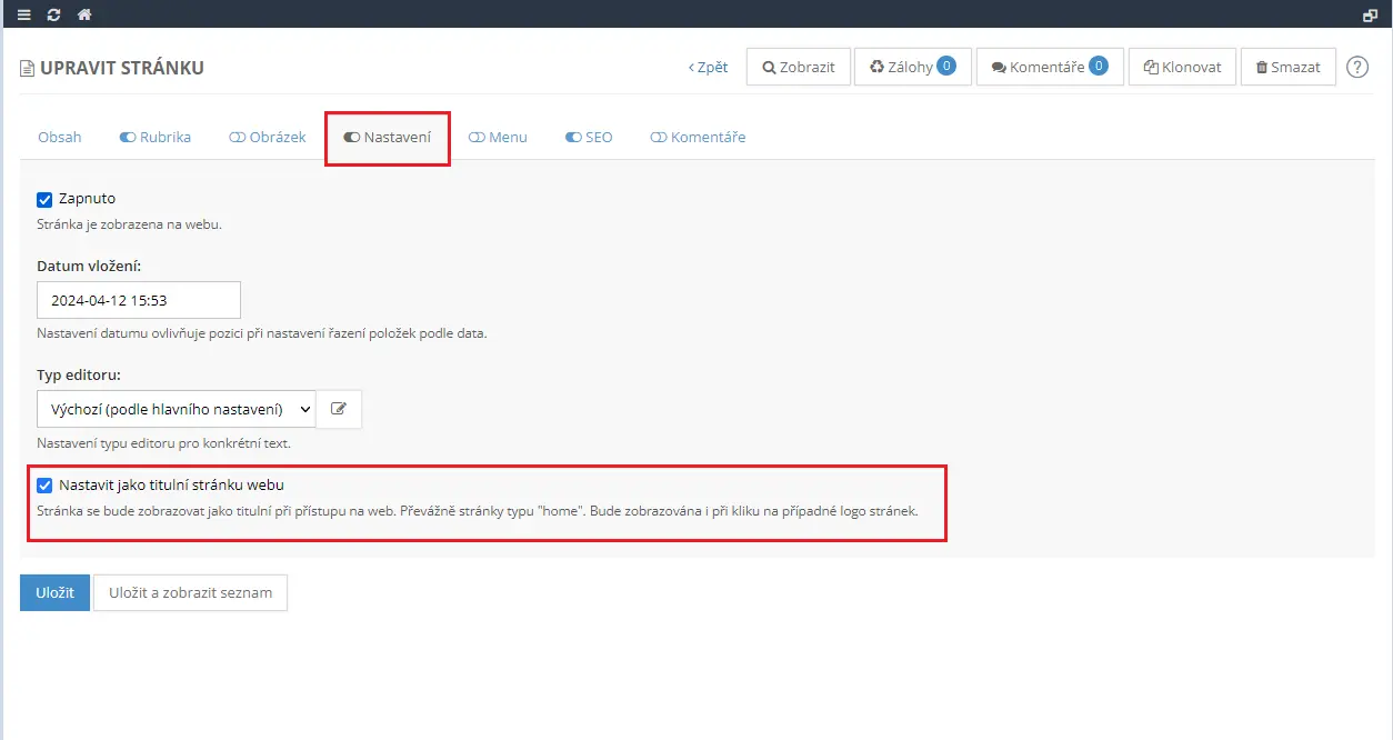 Aby vše fungovalo správně je potřeba námi vytvořenou stránku nastavit jako úvodní stránku webu. To provedete v editaci dané stránky, kde vyberete záložku /Nastavení/ a zde pak zaškrtnete možnost Nastavit jako titulní stránku webu a dialog uložíte.