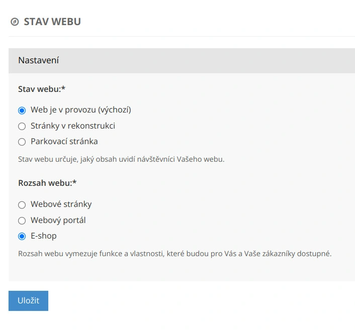 Nastavení Rozsahu webu se provádí sekci Můj účet → Stav webu (příp. kliknutím na ikonu v horní liště nalevo od adresy webu).