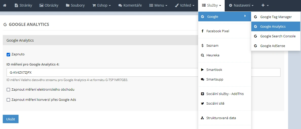 Aby se však data z e-shopu do Analytics posílala, je třeba si tuto možnost aktivovat v administraci vašeho webu a to v sekci /Služby/ kde vyberete možnost Google a v podvýběru možnost Gooogle Analytics.