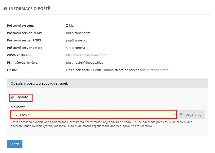 Přístupy k tomuto správcovskému e-mailu vám byly zaslány e-mailem při zřízení hostingu inPage, nebo je najdete na vašem zákaznickém účtu admin.czechia.com pod detailem vaší domény.