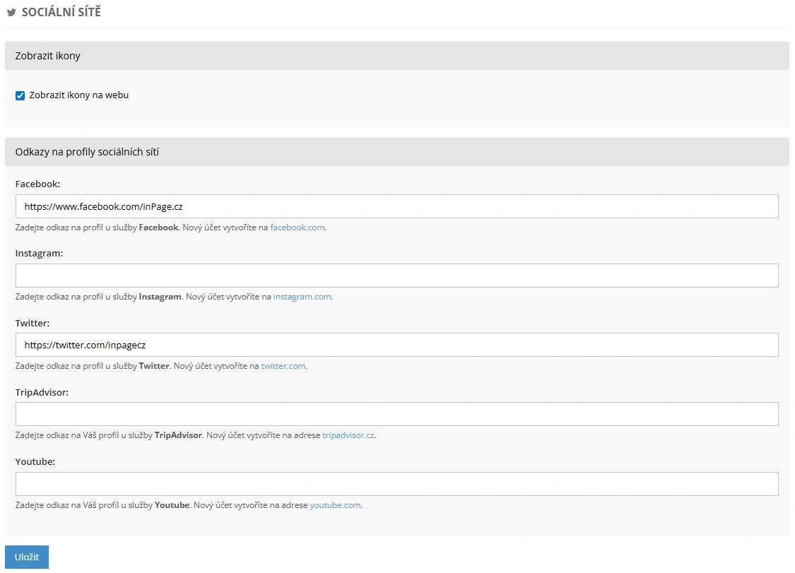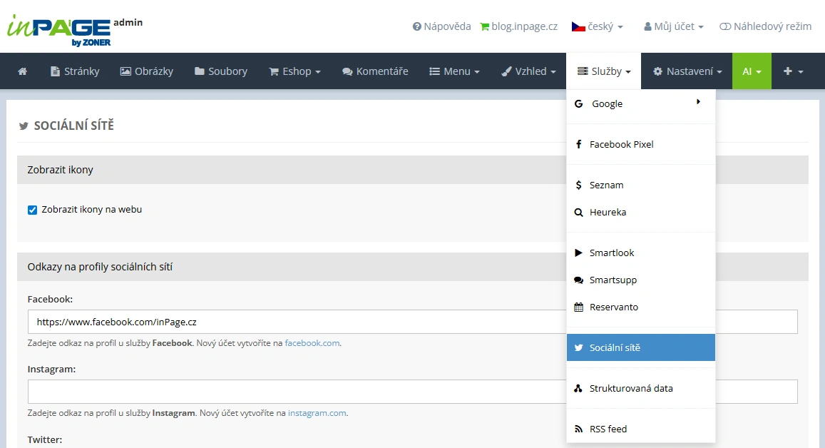 Odkazy na sociální sítě vyplníte v administraci webu v sekci Služby → Sociální sítě. Ke každé síti stačí vložit její URL adresu (odkaz na váš profil nebo stránku). Pro zobrazení na webu zaškrtnete dané políčko a úpravu uložíte.