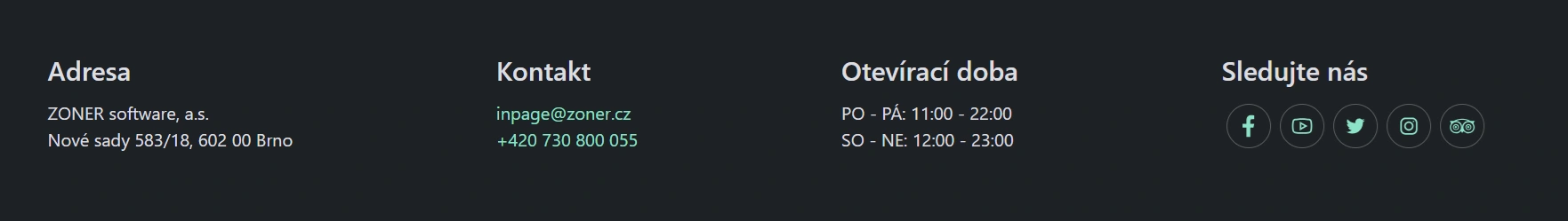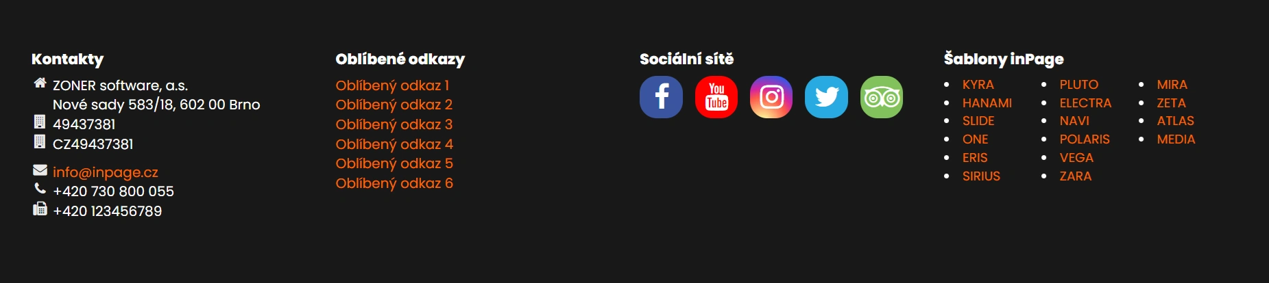 V inPage můžete na web snadno přidat odkazy na své profily na sociálních sítích. Odkazy se následně zobrazí jako ikony buď v systémové patičce, nebo v obsahové sekci Kontakty – podle toho, jaký způsob zobrazení vám vyhovuje.