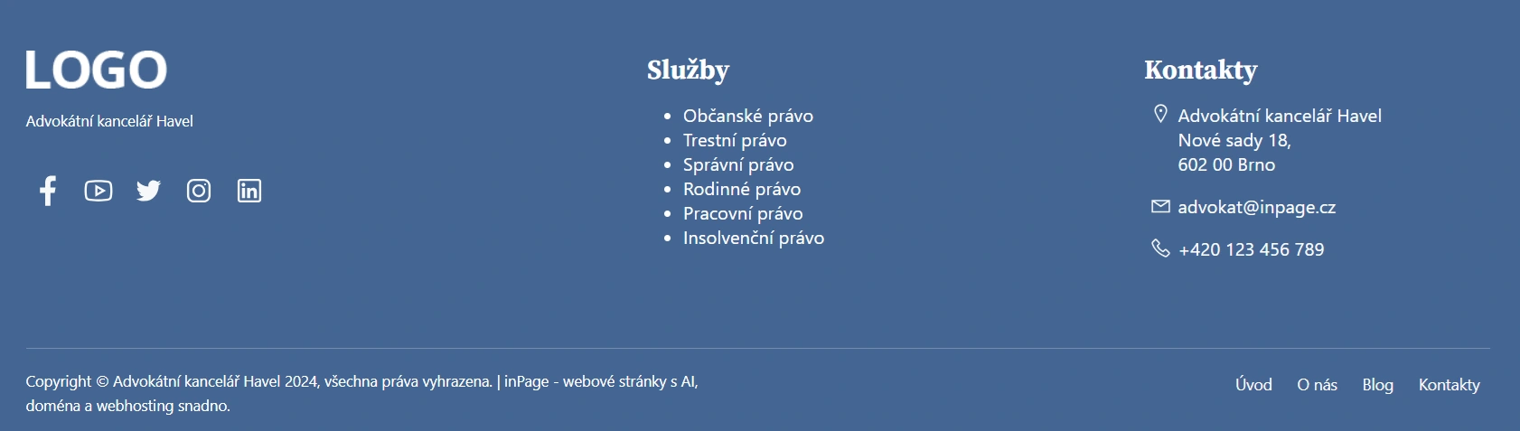 Příklad zobrazení sociálních sítí v patičce u profesní šablony Advokátní kancelář