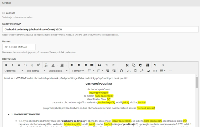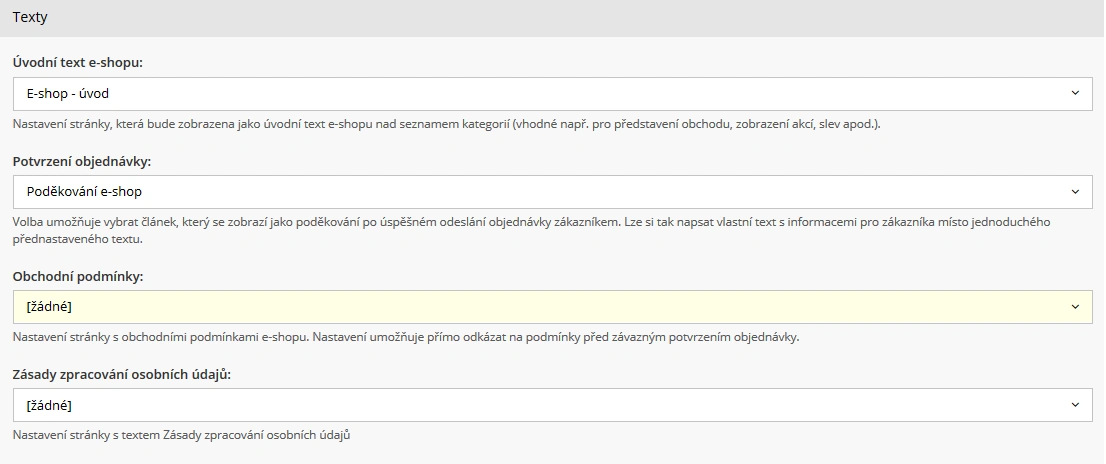Na závěr stačí podmínky uložit a v nastavení e-shopu je v části Texty vybrat jako obchodní podmínky vašeho e-shopu. Nastavení umožňuje na podmínky přímo odkázat před závazným potvrzením objednávky.