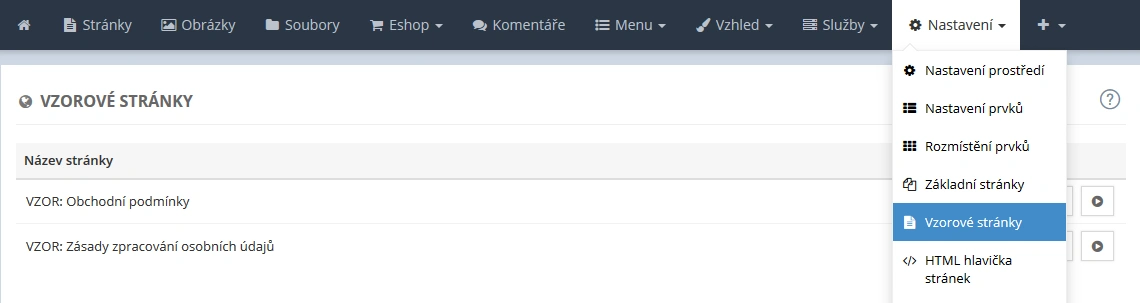 Tyto vzorové stránky naleznete v menu nové administrace v sekci Nastavení → Vzorové stránky. Po otevření této nabídky se vám zobrazí přehled vzorových stránek.