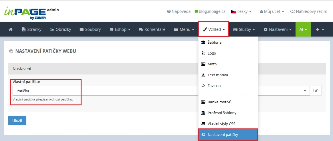 Jakmile máte patičku připravenou, je potřeba ji v administraci nastavit, aby se zobrazovala na webu. Přejděte do Vzhled → Nastavení patičky, v poli Vlastní patička vyberte stránku, kterou jste vytvořili, a vše uložte. Od této chvíle se bude vaše vlastní patička zobrazovat na stránkách.