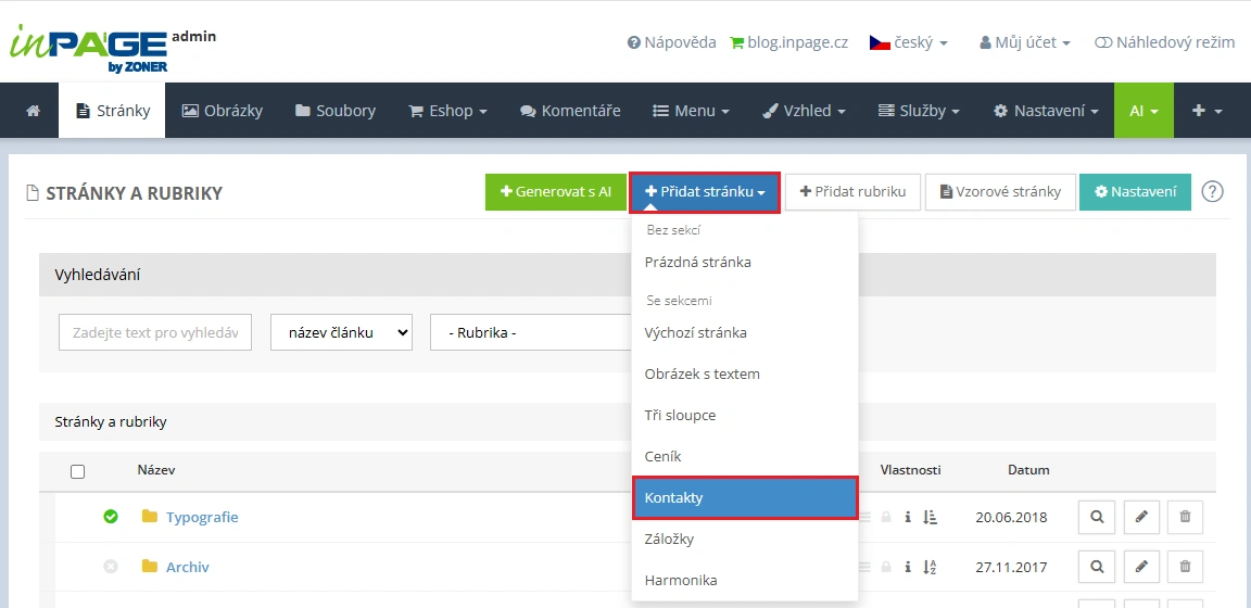 Nejprve si v administraci vytvořte novou stránku (můžete využít například stránku se sekcí Kontakty).