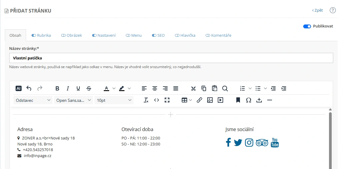 Obsah patičky můžete upravovat v editoru a využívat obsahové sekce, např. Kontakt, Mapa, Tři sloupce apod.
