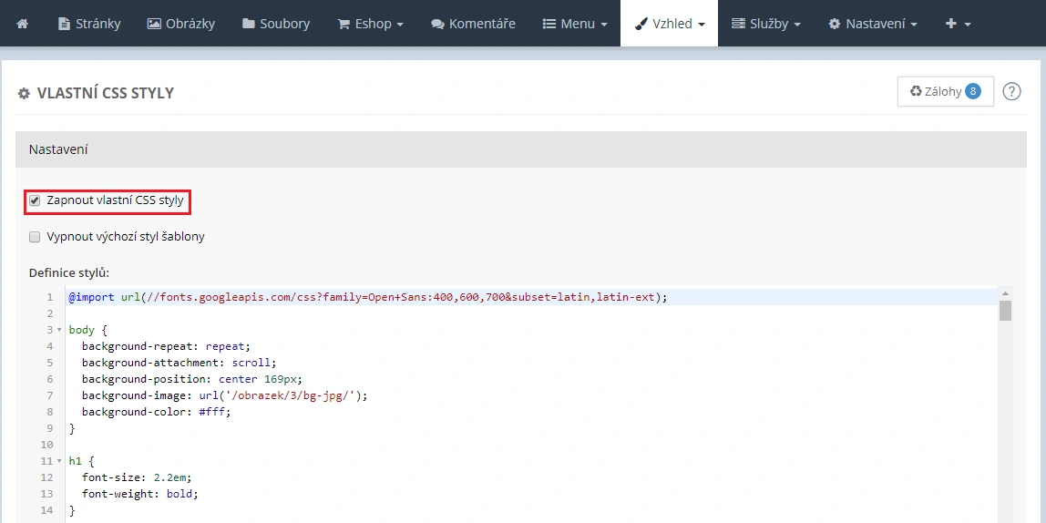Po přihlášení do administrace přejděte do sekce Vzhled → Vlastní styly CSS. Zde můžete vložit vlastní pravidla a pomocí nastavení určit, jakým způsobem se mají vůči šabloně chovat.
